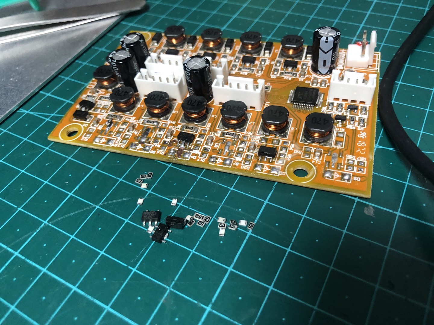 일단 칩들의 정확한 명칭이나 역할을 모르기 때문에 내가 할 수 있는 수리방법은 센터쪽 Red led 쪽과 관련된 모든 칩들을 떼어내서 정상 작동중인 led 쪽의 모든 부품과 교체하는 방법뿐이 없었다. 혹시 몰라 정상 작동중인 센터쪽 Green led 쪽 모든 칩들을 새로 구입한 열풍기로 한번 떼어냈다가 다시 붙여 테스트를 해보니 다시 잘 작동해서 자신감을 얻고 불이 들어오지 않는 센터쪽 Red led 쪽 칩들 작업을 했다.