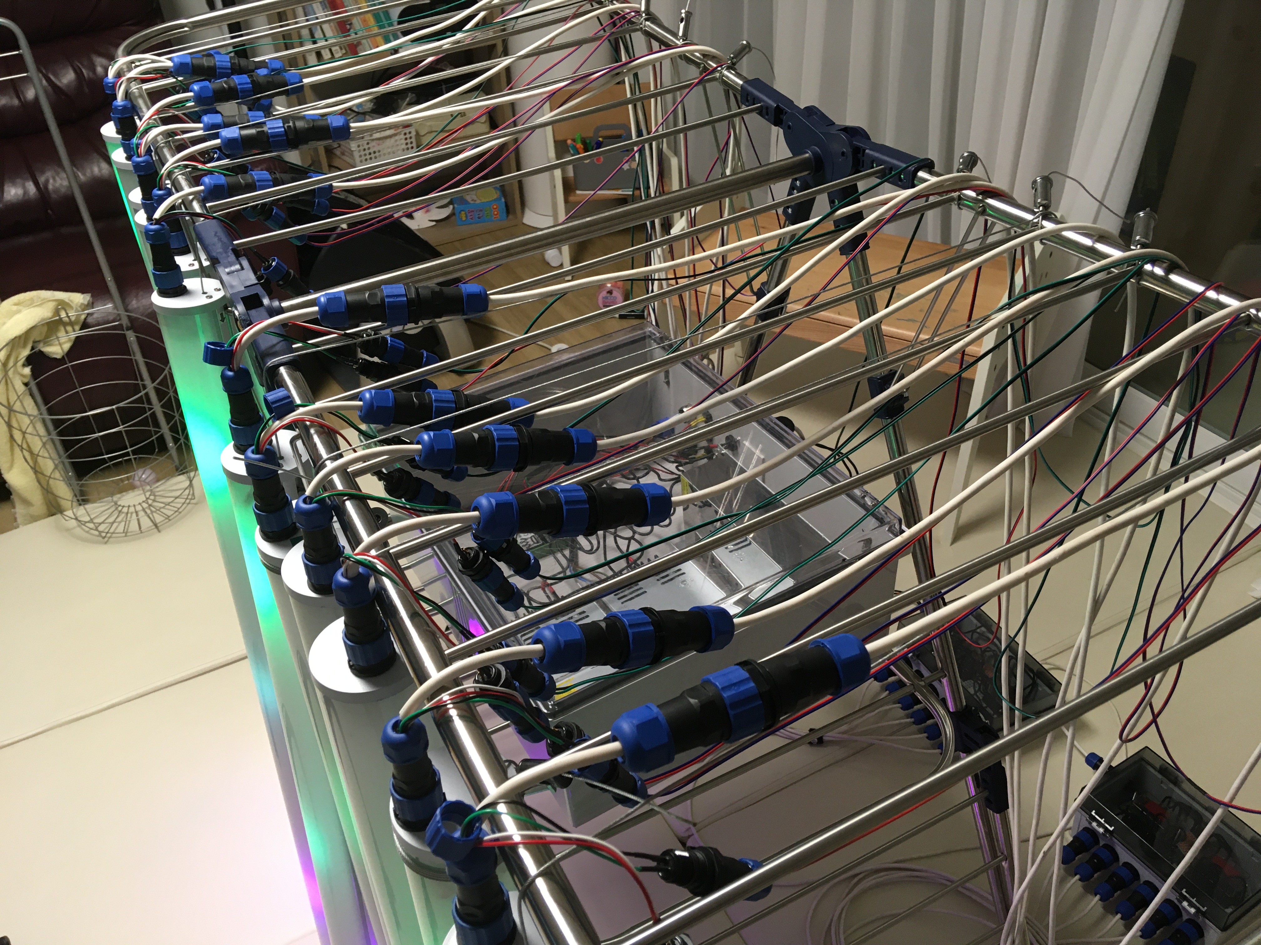 세번째 문제는 wiring 문제였다. 내 led bar의 경우 꼬리에 꼬리는 무는 방식이 아니고 호박이 매달리는 방식이라 6선 wiring이 필요한 joint가 필요했는데 20개를 만들다보니 그 중에 data in, data out이 바뀐 joint가 하나 있었나보다. 그것때문에 최종 테스트때 flicker 발생했다. 이 flicker 잡는데 3달 정도 걸린거 같다. 한 2달 잡다가 너무 답이 안나와서 포기하고 한 몇달쉰다음 비수기에 다시 한달 정도 매달리다 우연히 10개씩 테스트하다가 혹시?? 하고 검사 후 발견했다. 이거 해결하고 정말 엄청 소리 질렀다.