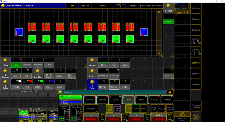 Grand MA2에 내장 되어 있는 아래의 Stage View는 2D라 당연히 Multi Cell을 표현하지 못한다. 그래서 하얀 줄만 보인다.