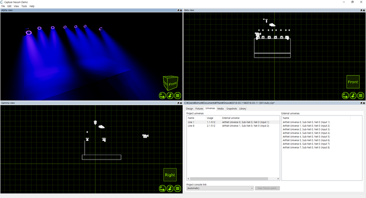 MA2에는 기본적으로 2D 시뮬레이터인 Stage View가 있다. 간단한 프로그래밍을 할때 괜찮긴 하지만 고보나 여러 분위기를 자세히 보려면 그래도 3D 시뮬레이터가 필요하다. 그래서 Realizzer 3d나 Capture 둘 중에 하나 고르기로 했는데 Realizzer는 나온지 얼마 안되서 그런가 참고할만한 자료나 메뉴얼이 별로 없어서 Capture를 사용하기로 했다. 레이져 시뮬을 봐도 시뮬레이션 성능자체는 Realizzer가 월등해 보이나 나는 레이져도 안쓰고... 뭐 Capture도 그리 나빠 보이지 않았다. 그리고 결정적으로 Capture 데모판은 매 1시간 30분마다 재시동만 하면 무료로 모든 기능을 사용할 수 있어서 선택하지 않을 수 없었다. 설정 및 show 파일 저장을 못하는게 큰 제약이기는 하지만 꼼수를 이용하면 그렇게 불편하지는 않다.