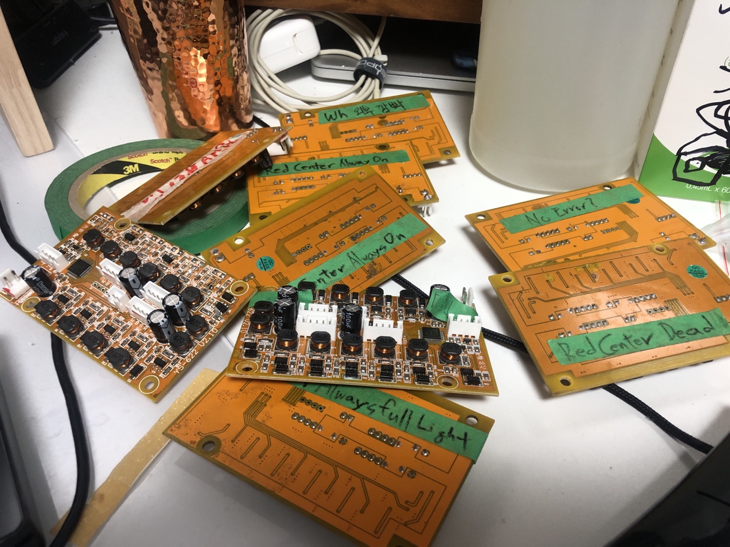 1년 전에 교체한 19x15w led 무빙워시 조명기가 너무 자주 고장이 난다. 이전에 사용했던 19x12w led 무빙워시는 led 드라이버 보드 4개로 4~5년은 버틴거 같은데 이번 무빙은 led 드라이버 보드를 벌써 10개나 교체했다. 주로 고장은 세 그룹으로 이루어진 led 그룹중 일부 색이 켜지지 않거나 일부 색이 계속해서 켜져있는 상태로 유지되는 고장이다. 새로운 무빙워시를 10년은 넘게 맘편히 쓸려고 led 드라이버 보드를 20개나 마련해뒀는데 일년만에 반타작이 나버렸다.